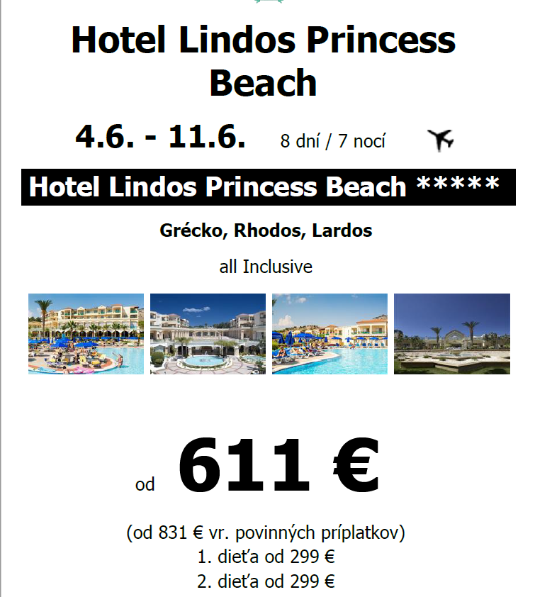 Petra 2019-02-21T12:06:37+00:00Destinácia : Chorvátsko / Dalmácia/ Vodice Hotel : Imperial Klara 3*+ Strava : all inclusive Doprava : vlastná, autobusová Termíny : 13.6.-20.6.2019, vlastná doprava, cena na osobu- 360,30€, cena pre rodinku s dieťaťom do 13r.-756,2