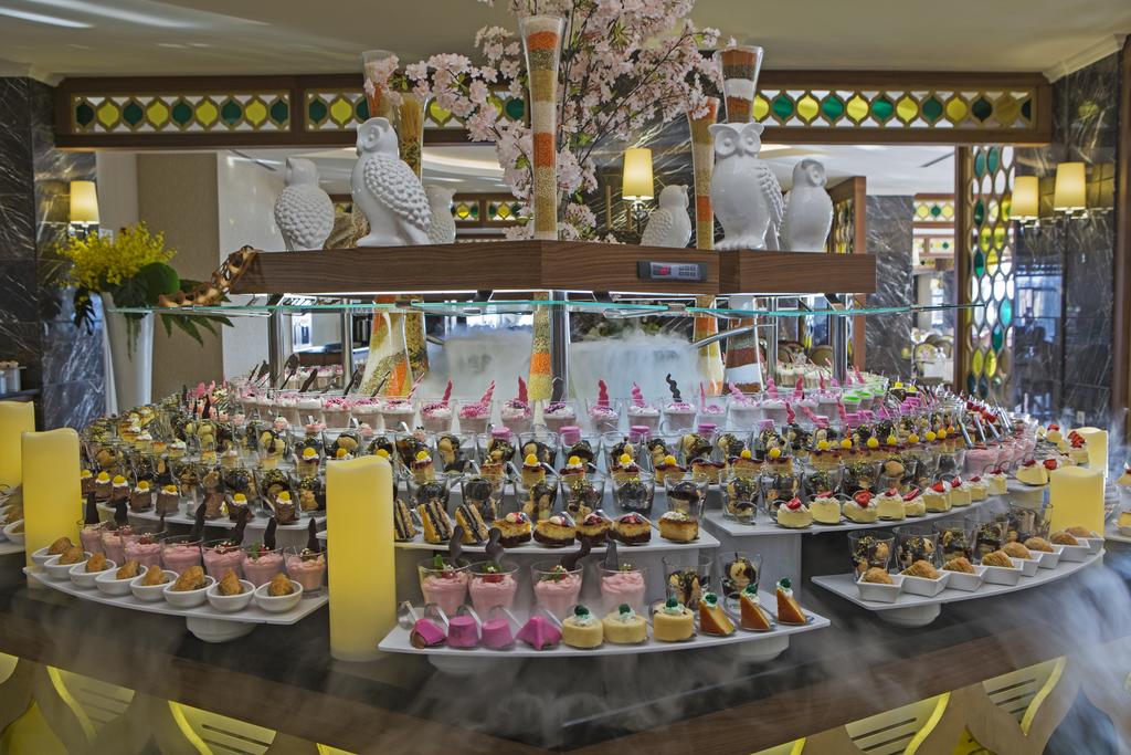 24 hod. ultra all inclusive formou bufetu, raňajky 07:00 – 10:00, neskoré raňajky 10:00 – 11:00, obedy 12:30 – 14:00, večere 19:00 – 21:00, nočný bufet 24:00 – 01:00, snacky 11:00 – 19:00 a 21:00 – 02:00, gozleme 12:00 – 16:00, cukráreň 11:00 – 23:00, zmrzlina 14:00 – 16:00, a´la carte reštaurácie (1x za pobyt zadarmo, rezervácia nutná vopred – turecká, rybacia) 19:00 – 21:00, lobby bar 09:00 – 24:00, bar pri bazéne 09:00 – 24:00, disco bar 23:30 – 02:00, miestne alkoholické, nealkoholické a niektoré importované nápoje. Za poplatok: importované nápoje, a´la carte reštaurácie (sushi, talianska) 19:00 – 21:00, čerstvé ovocné šťavy, vitamin bar. Podrobný rozpis ultra all inclusive programu dostanete na recepcii pri ubytovaní.
