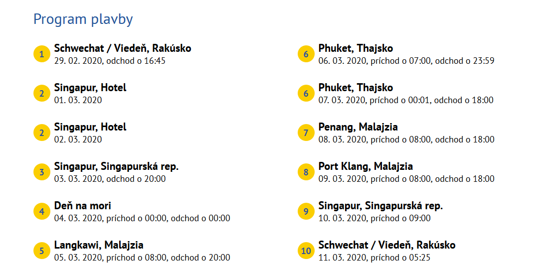 Plavba so slovenským sprievodcom, spiatočnou letenkou z Viedne, transfermi v Singapure a ubytovanie na 2 noci v hoteli.